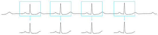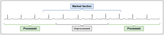 After signal preprocessing, each successive PQRST wave present in the ECG signal was extracted as an individual heartbeat as demonstrated in Figure 7. Each heartbeat was extracted from the ECG signal using a window of 600 ms size, resulting in the extraction of 216 samples per heartbeat. Each window contained 108 samples from before the R-peak and 108 samples from after the R-peak. Each extracted heartbeat was assigned their original label based on the heartbeat annotations provided in the MIT-BIH database, while heartbeats extracted from the PhysioNet challenge data were assigned the Q class representing noisy readings.