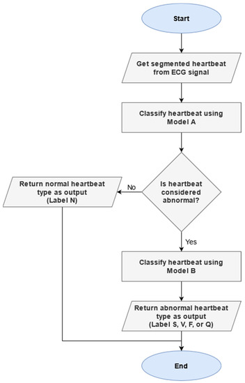 In order to perform the two-phase classification, a composite model consisting of two separately trained models is used. Figure 8 illustrates the flow of operations during the two-phase classification process. The first model classifies heartbeats into two classes, distinguishing between normal heartbeats and abnormal heartbeats. In this case, any unclassifiable signal or heartbeats that cannot be categorized as the N label are considered abnormal and classified as the A label. If a heartbeat is classified as abnormal by the first model, the second model is used to determine the type of abnormal heartbeat. The heartbeat is classified into one of the four abnormal heartbeat types as either S, V, F, or Q.