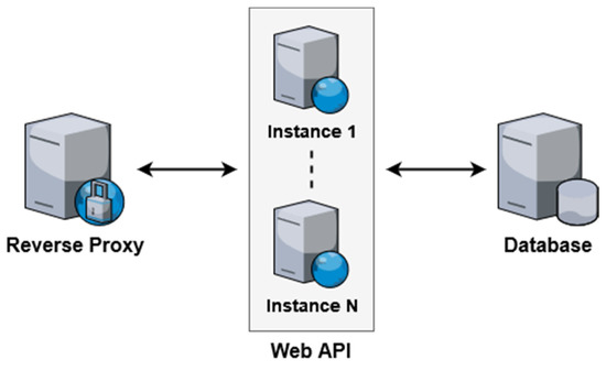 In order to validate the benefits of horizontal scaling, test deployments were performed with a dynamic number of web API instances. The web API was chosen for evaluation as it performs the primary processing and data management tasks within the system. Additionally, the performance characteristics of the employed database software when sharding horizontally have been thoroughly tested and documented. Figure 9 illustrates the deployment architecture used for the evaluation.