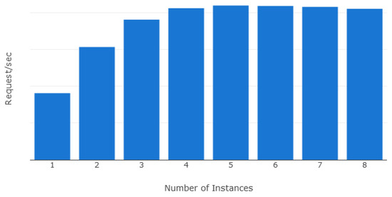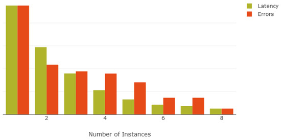 Figure 10 demonstrates that the number of requests successfully processed per second increases with the number of deployed instances, plateauing between five and eight instances due to the single reverse proxy and database in the test environment. On the other hand, Figure 11 indicates that raising the number of deployed instances steadily decreases both the latency and number of erroneous requests. As each instance can only process a limited number of requests simultaneously, spreading the load across multiple instances provided greater parallel processing of incoming requests.