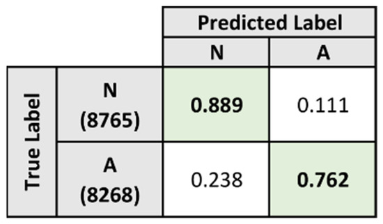 Figure 13 presents the confusion matrix for model A after classification of the heartbeats in the test dataset. From the confusion matrix, the model is shown to perform better at identifying normal heartbeats as compared to abnormal heartbeats. The model correctly classified 88.9% of the normal heartbeats, while the remaining 11.1% were misclassified as abnormal heartbeats. The model demonstrated a lower performance when classifying abnormal heartbeats as it classified 76.2% of the abnormal heartbeats correctly, while the remaining 23.8% were misclassified as normal heartbeats. The performance metrics for model A were derived from the confusion matrix and presented in Table 5.