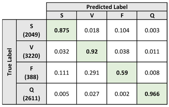 The classification results for model B on the test dataset are summarized in Figure 14. The confusion matrix indicates that the model performed well when classifying heartbeat samples under the S, V, and Q labels. The percentage of correctly classified heartbeats under the S, V, and Q labels are 87.5%, 92%, and 96.6% respectively. For the heartbeats under the F label, the model was only able to classify 59% of the samples correctly while the remaining samples were primarily misclassified under the S and V labels. The performance metrics for model B were derived from the confusion matrix and presented in Table 6.