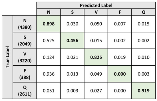 The model exhibited a specific characteristic when classifying samples that belong to the S and F labels. When examining the classification results for these labels, it is clearly shown that the majority of the samples belonging to these labels were misclassified as the N label. A total of 95.1% of the samples belonging to the S label were misclassified as the N label, while 77.8% of the samples belonging to the F label were misclassified as the N label. As for the remaining samples under the S and F labels, the majority of the misclassification occurs when the samples were mislabeled as the V label.