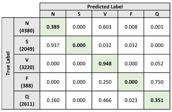 The preparation process of the composite model provides greater insights into the predictive capabilities of the selected ECG algorithm. The algorithm is found to perform well when classifying abnormal heartbeat types, but faced difficulties in distinguishing between normal and abnormal heartbeats. In Table 6, it is shown that model B, which was trained specifically for identifying abnormal heartbeat types, was able to perform well for the S, V, and Q labels. Additionally, the model was able to correctly classify 59% of the heartbeats under the F label as shown previously in Figure 14.