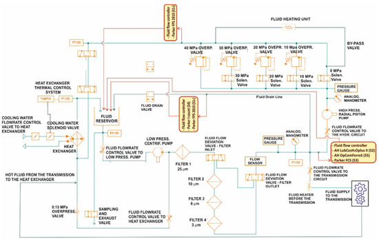 Positions of the sensors along the fluid lines of the test rig. The sensors are grouped in the yellow boxes, while the oil in- and outflow are described by red lines.