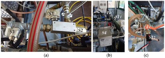 Sensors installed in the test rig: (a) secondary line supporting S2, S3, and S5 and flow controller (not visible), derived from the main oil delivery line; (b) secondary line supporting S11 and S4 and the flow controller, Fc derived from the main oil delivery line; (c) line supporting S12 and Fc, derived from the 40 MPa valve outlet and terminating directly in the reservoir.
