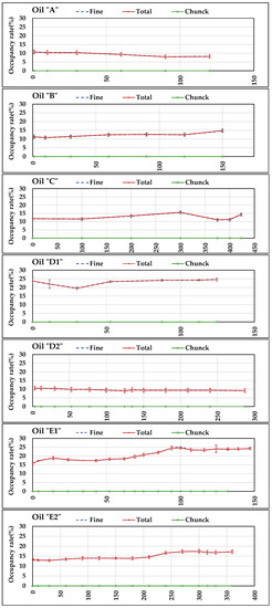 Figure 13 reports the diagrams of the daily averages of occupancy rate (fine fraction, chunk, and total) measured by S5 in all days of tests. The accuracy of S5 was not reported in the datasheet. However, the standard deviations of the daily measurements are reported in the diagrams. It can be noticed that all measurements relating to “fine fraction” and “total” start (at time 0 h) from values >0, which derive from the Fe particles retained by S5 in previous tests, as explained in Section 2.2. Therefore, the occupancy rate in each test, referred to the starting value, in general seems to be rather stable with small variations positive or negative, which mainly occurred however in the oils that were less stable relating to the other measured parameters discussed above (A, B, D1, and E1). The standard deviations values did not exceed 10% except in D1 (second value) testifying a good stability in daily measurements. No coarse particles (chunk) were ever retained by S5 magnetic head.
