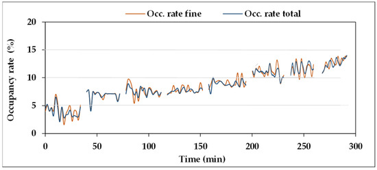 In order to clarify the meaning of such behaviour, S5 underwent a specific test, in the equipment of Figure 7, based on controlled conditions of Fe2O3 contamination of a mineral UTTO oil (density: 0.89 g mL−1). The trends of the occupancy rates at seven increasing levels of Fe2O3 contamination are reported in Figure 14 for “fine fraction” and “total”. Furthermore, in this case, the test started from an initial occupancy rate value >0 (about 5%), derived from previous tests, and progressively increased with further Fe additions to the oil. No chunks were detected.