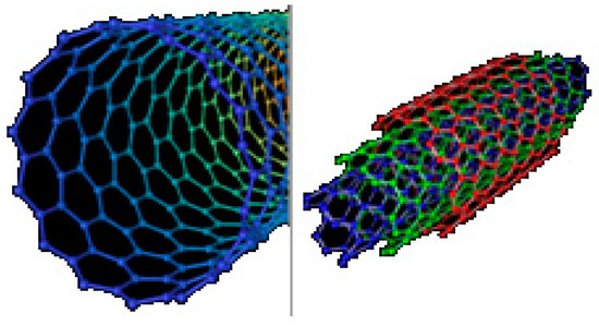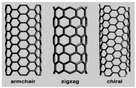 The CNTs employ two types, as follows: single walled carbon nanotube (SWCNT) and multi walled carbon nanotube (MWCNT). The SWCNT consists of a sheet of single cylinder of 1–2 nm and MWCNT consists of more single cylinder with 10 nm as illustrated in Figure 1, for more details, refer to references [20,21]. A SWCNT operates as semiconductor or a conductor which depends on the arrangement of atoms along the CNTs. There are three types of SWCNT models, as follows: zigzag, armchair, and chiral CNTs. The three types of CNTs are shown in Figure 2 [21,22]. The n1 and n2 are the coefficients that signify the positive integers and features the chirality of the CNTs. If n1 and n2 are equal to zero, it is zigzag, and if n1 ≠ n2 or n1 or n2 ≠ 0, it is chiral CNT. Furthermore, the armchair is described as n1 and n2 equal to n.