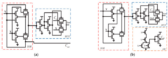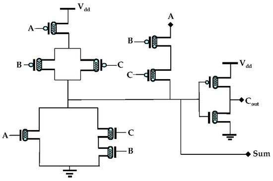 - Naseri, H.; Timarchi, S. Low-Power and Fast Full Adder by Exploring New XOR and XNOR Gates. IEEE Trans. Very Large Scale Integr. (VLSI) Syst. 2018, 26, 1481–1493. [Google Scholar] [CrossRef]