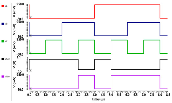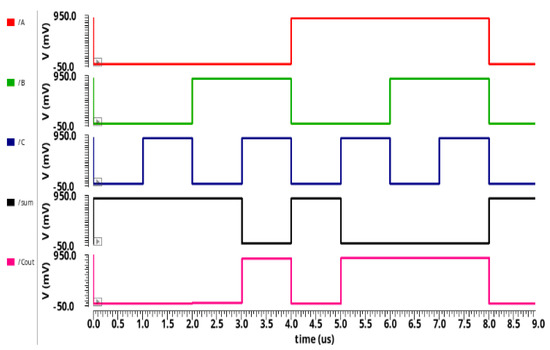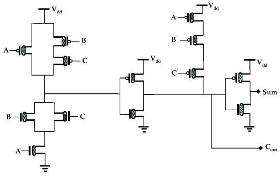 In this section, 10-transistor approximate adder, based on 32 nm CNFET technology, is proposed. Figure 6 represents the design of the 10T approximate adder. This design consists of six p-CNFETs and four n-CNFETs. To improve the consumption of power and design efficiency, the 10T adder is considered. In this design, there are three inputs known as A, B, and C, and two outputs known as sum and carry output (Cout). A supply voltage Vdd of +0.9 V is considered to carry out the simulation through the HSPICE tool. When an input of 0 is considered for A, B, and C, the sum output has a logical value of 1. Similarly, when logic 1 is considered for all inputs, then the sum has a logical value of 0. The truth table for the proposed 10T approximate adder is shown in Table 3. From the truth table, it is clear that the sum has two erroneous outputs in all of the cases in which all of the input logic is either 0 or 1. When logic 0 is considered for A and 1 for B, C the Cout signal has a logical value of 1. Whereas, when logic 0 is considered for A and 1 for B, C the output is considered as 1. From the carry output in Table 3, it is clear that when all the logic combinations are considered for the output signal, it has no errors. This decreases the power consumption and increases the efficiency of design. The proposed sum and Cout expressions for the 10T approximate adder shown in Figure 6 are as follows: