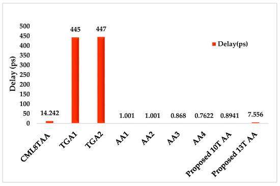 Figure 11 illustrates the delay (ps) comparison with the existing circuits and proposed 10T AA and 13T AA. The propagation delay for the proposed circuits is measured between the three inputs A, B, and C and two outputs sum, Cout that reach the voltage supply at 50%. The fall delay and rise delay is measured among the circuits with half of the threshold value. The proposed 10T AA has the better delay value of 0.8941 ps compared to that of 13T AA at 7.556 ps. Furthermore, the TGA1, and TGA2 designs have the higher delay compared to the proposed 10T AA and 13T AA. The proposed 10T AA, AA 3 and AA 4 are considered to be better in terms of efficiency.