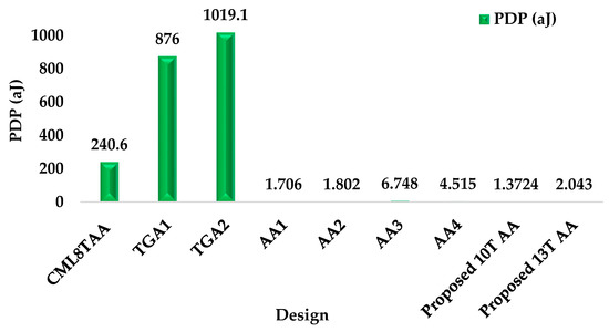 The power-delay product for the circuit is calculated as the product of the average power (µW) and the delay (ps) [25]. Figure 12 displays the comparison of PDP with existing and proposed circuits. The proposed 10T AA and 13T AA have the reduced power consumption of 1.372 × 10−18 J and 2.043 × 10−18 J. The maximum PDP of the circuits are TGA1, TGA2, and CML 8T AA designs. When compared to existing circuits and the 13T approximate adder, the 10T AA has the better PDP of 1.372 × 10−18 J. From the results, it is shown that in order to increase the lifetime of battery for portable or electronic devices, reduced and better PDP is to be considered.