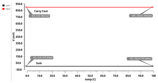 Figure 14 describes the impact of stability of temperature on the proposed 13T AA design. It was observed from the simulation that the stability is 0.00000034% at a range of 0 °C to 100 °C (Figure 14). The simulated temperature stability results of Figure 6 and Figure 7 indicate no deviations in sum or carry. Hence, the proposed approximate adders are quite suitable for commercial and industrial application tools.