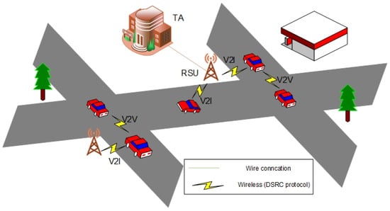 VANETs are an extreme case of Mobile Ad-Hoc Networks (MANETs), in which the vehicle nodes are highly mobile. The main structure includes three components of the VANET, namely a trusted authority (TA), some fixed road-side units (RSUs), and many mobility on-board units (OBUs), as shown in Figure 1. Each vehicle has OBU to share safety traffic-related messages with others or neighbor RSU via vehicle-to-vehicle (V2V) communication and vehicle-to-infrastructure (V2I) communication, respectively. More precisely, the main goals of intelligent transport system (ITS) are to offer safety improving, and driving efficiency in the road environment. With these goals in mind, VANETs have become a promising technology.