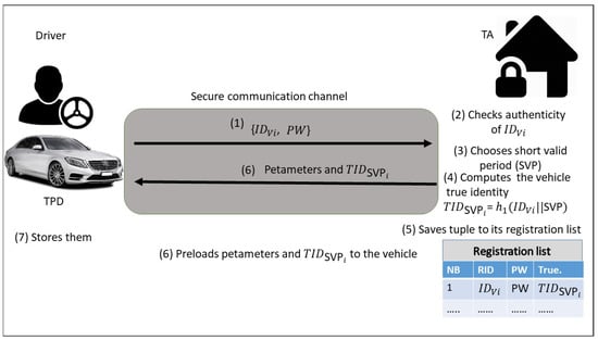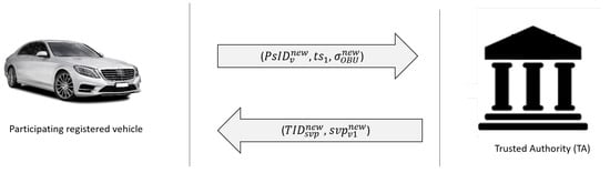 Prior to the vehicle leaving the factory, the vehicle registration phase via a secure channel (offline) should be executed. Due to the core problem study in this paper, the vehicle’s true identity should be regularly updated to avoid side channel attack. Hence, the proposed scheme is resisting impersonation attacks. As shown in Figure 2, the TA registers each vehicle as follows: