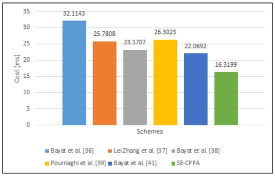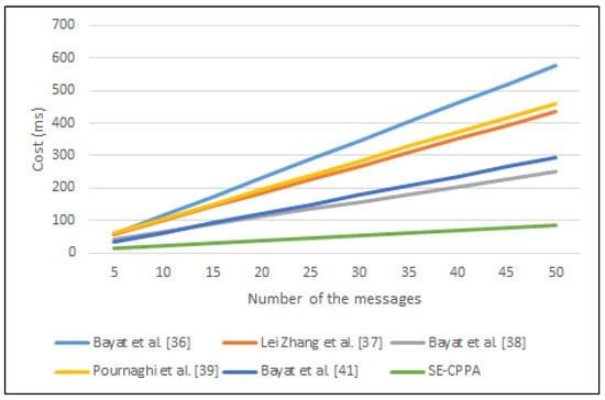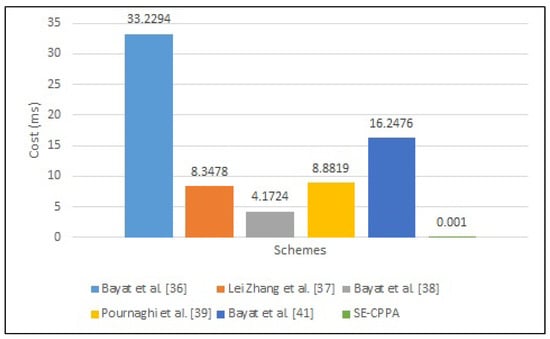 The process of single-signature verification in Bayat et al. [36] scheme consists of four bilinear pair operations , three scalar multiplication operations , a MapToPoint hash function operation and two cryptographic hash function operations ; hence, the whole computation cost of the single-signature verification process is . The process of single-signature verification in Lei Zhang et al. [37] scheme consists of three bilinear pair operations , two MapToPoint hash function operations and three cryptographic hash function operations ; hence, the whole computation cost of the single-signature verification process is . The process of single-signature verification in Bayat et al. [38] scheme consists of three bilinear pair operations , a scalar multiplication operation , and a MapToPoint hash function operation ; hence, the whole computation cost of the single-signature verification process is . The process of single-signature verification in Pournaghi et al. [39] scheme consists of three bilinear pair operations , three scalar multiplication operations , a MapToPoint hash function operation and a cryptographic hash function operation ; hence, the whole computation cost of the single-signature verification process is . The process of single-signature verification in the Bayat et al. [41] scheme consists of a bilinear pair operation , four scalar multiplication operations , an addition point operation , a MapToPoint hash function operation , and two cryptographic hash function operations ; hence, the whole computation cost of the single-signature verification process is . The process of single-signature verification in the proposed SE-CPPA scheme consists of two bilinear pair operations , two scalar multiplication operations , and two cryptographic hash function operations ; hence, the whole computation cost of the single-signature verification process is . Figure 6 shows the comparison of single-signature verification process.