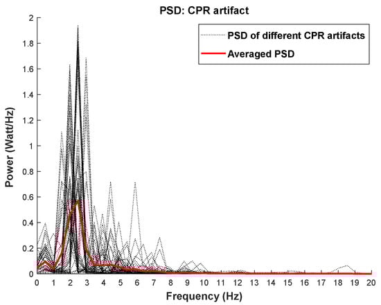 • To suppress the CPR components from the underlying ECG time series, the dominant frequency of CPR artifact needs to be detected and removed. According to [21], the recommended rate for performing chest compressions during CPR is 100–120 compressions per minute. However, CPR’s fundamental frequency can be observed as high as 3 Hz when performed too quickly. PSD plots of different CPR artifact samples for both shockable and non-shockable rhythms shown in Figure 1 demonstrate that the fundamental frequency of the chest compressions is localized within (1–3) Hz. In this figure, the red line is the averaged PSD of all CPR samples.