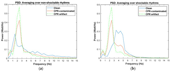 • It is widely recognized that the spectral content of non-shockable ECG rhythms is distributed over a wider frequency band than that of shockable rhythms (Figure 2a) [5]. The shockable rhythms’ spectral power is largely concentrated within (3–6) Hz, as reported in [12,22], and also shown in Figure 2b. In Figure 2, the averaged PSD for both non-shockable and shockable rhythm types are shown in the left and right panels, respectively. PSDs of both rhythm types are similar when they are contaminated with CPR artifact (red lines in Figure 2a,b).