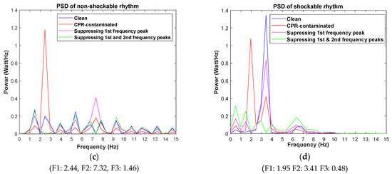 Figure 3. (a) Non-shockable ECG sample and (b) shockable ECG sample—1st row: desired clean ECG, 2nd row: CPR-contaminated ECG, 3rd row: filtered ECG after removing highest frequency peak, 4th row: filtered ECG after removing both highest and 2nd frequency peaks. (c) PSD plots of non-shockable ECG sample and (d) PSD plots of shockable ECG sample. The PSD of the desired clean ECG, CPR-contaminated ECG, filtered ECG after removing highest frequency peak, and filtered ECG after removing both highest and 2nd frequency peaks are plotted in blue, red, purple, and green, respectively.