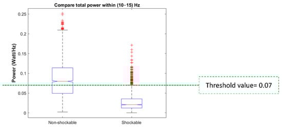 To determine the threshold value for the spectral power in the frequency band (10–15) Hz, their boxplots are plotted for both shockable and non-shockable samples (Figure 5). Mean standard deviation values are also shown in Table 2. According to Figure 5 the upper limit of the spectral power in the frequency band (10–15) Hz for shockable samples is 0.072. For example, only 6% of shockable samples have spectral power above 0.072 and they are the outliers (shown as “+” marks). Therefore, a threshold value of 0.07 Watt/Hz was set to avoid removing the artifacts’ second highest spectral peak from the shockable rhythms.