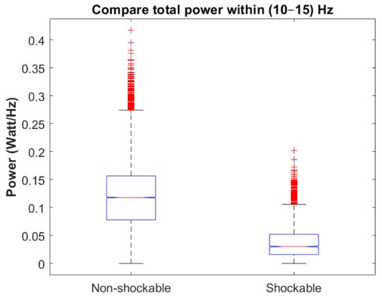 Figure 6. Box plots for comparing spectral power in the frequency band (10–15) Hz for shockable and non-shockable samples for the validation set.