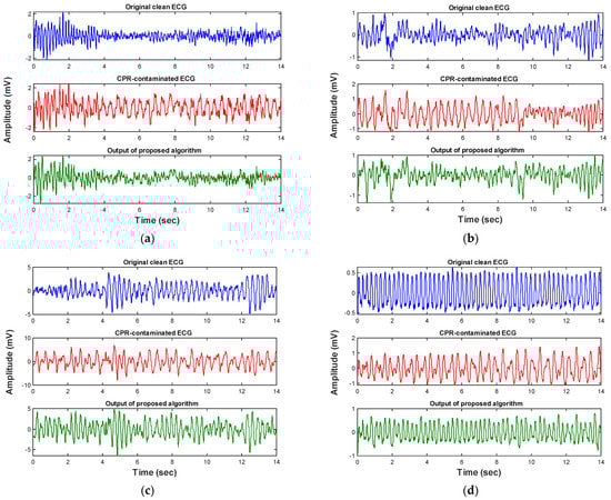 Figure 8. (ad) Show the performance of the condition-based filter on four different representative shockable ECG rhythm types (test set). Each panel represents the ECG data segment of a different subject.
