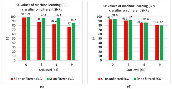In order to further represent the impact of our condition-based filtering method in improving the results of rhythm analysis algorithms, we also combined the proposed method with the backpropagation (BP) neural network approach introduced in [23] for shockable vs. non-shockable classification. Results of this combined approach are shown in Figure 9c,d and the cases 3–4 in Table 5. All ECG samples were split into training and test datasets. The 52 CPR artifact samples were also divided randomly into two parts, having 26 CPR artifact samples for both training and test datasets. These CPR-contaminated samples were added to the clean data so that different SNR levels of 0, −3, −6, and −9 dB were achieved. Consequently, the training (with 4914 non-shockable and 910 shockable samples) and test (with 5122 non-shockable and 962 shockable samples) datasets were created. A weighting technique was used to make a more balanced training dataset. Using this technique, a higher error weight was assigned to the class with the lower number of samples [23]. Overall training and testing processes were repeated five times and the results were then averaged. Figure 9 and Table 4 demonstrate the SE values for shockable and SP values for non-shockable rhythms. According to panel c of Figure 9, when our proposed filtering algorithm was combined with the BP neural network classification algorithm, the higher SE values (>96%) were achieved. More importantly, this is still true for low SNR level of −6 dB, as well. As expected, SE values decrease with lower SNR levels. However, the filtering approach performed well despite severe corruption levels as SE increased from 77 to 85.7% for SNR level of −9 dB (see Figure 9c). As shown in Table 5, the averaged SE, SP, and the overall accuracy (ACC) of the BP classifier for all SNR corruption levels are 86.3, 87.8, and 87.6%, respectively; applying the proposed filtering approach increased these values to 94.5, 88.3, and 89.2%, respectively. The results in Table 5 indicate that when our proposed filtering algorithm (fourth row) was combined with the BP neural network classification algorithm instead of Defibtech’s classification algorithm, this combined approach provided the best results in shockable rhythm detection with the averaged SE value of 94.5% for all SNR corruption levels. However, the Defibtech classifier has a slightly better performance for non-shockable rhythm detection.