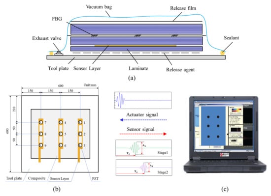 Carbon fiber-reinforced plastics (CFRPs) have gained increasing applications in the aerospace and automobile fields due to their extraordinary performance such as high specific strength and stiffness, corrosion resistance, and strong designability [,]. Thermoset CFRPs are commonly manufactured by stacking prepregs, and then heat and pressure are applied to them to cure the resin and exclude air voids []. For mass production of composite materials, vacuum bag molding technology is gaining interest due to its simplicity, cost competitiveness, and short production time. However, the curing reaction of the resin is complicated, especially for co-cured large-scale composite materials, and can potentially induce molding defects, such as dry spots, voids, or delamination, along with the mechanical property reduction of the final parts induced by improper manufacturing conditions, such as cure temperature and preservation time [,,]. Borrero et al. [] compared five curing conditions on the durability and compressive strength of concrete to recommend the most effective curing conditions on concrete’s characteristics. Daneshvar et al. [] investigated the dynamic behavior of five small-scale FRP-strengthened corroded steel-reinforced concrete (RC) slabs experimentally and numerically. The experimental results showed that FRP strengthening helps to improve the dynamic performance of the corroded plate. With the increasing demand for the performance of composite structures, many structural health monitoring (SHM) methods are required to be incorporated into life-cycle monitoring plans to obtain higher optimal quality []. Accordingly, a number of sensing and measurement technologies have emerged such as optical fiber sensing [,,,], ultrasonic sensing [,,,], electromechanical impedance [,,], thermometers [,], and pressure transducers [,]. According to these sensing technologies, they enable one to follow manufacturing parameters such as the progress of the reaction, the residual stress, the development of the resin complex modulus, and the events during the curing cycle such as gelation and vitrification. To monitor the curing parameters, ultrasonic testing is an effective method, which is sufficiently sensitive to structural status changes. Koissin et al. [] adopted a nonlinear ultrasonic immersion technique to monitor the resin curing in an aluminum-adhesive-aluminum laminate. Khadka et al. [] embedded a fiber Bragg grating (FBG) sensor and thermocouple in an epoxy system cured at 12 °C to determine its curing characteristics. However, they neglected the impact of the fiber on the resin, which would lead to inaccurate measurement results. The actual trend in research deals with the application of the embedded sensor network to perform in situ monitoring, with real-time and auto-checking abilities []. The embedded smart system is beneficial to reveal the complex physical phenomena inside materials and can be integrated permanently with the molded composite materials to provide information about the structural performance changes during its whole life-cycle. For achieving life-cycle monitoring of composite structures, Eum et al. [] used optical fiber sensors to monitor both the manufacturing process and the strain of composite structures for quality assurance and integrity assessment. Furthermore, Minakuchi et al. [] performed life-cycle monitoring of a large-scale CFRP by fiber-optic-based distributed sensing. However, these measurement methods stated above pose the problem of localized sensing and the limitations of curing parameter monitoring. In contrast to these sensing technologies, piezoelectric sensors have a large-scale sensing ability due to their long-distance propagation and can achieve in situ process monitoring and in-service inspection based on ultrasonic propagation.