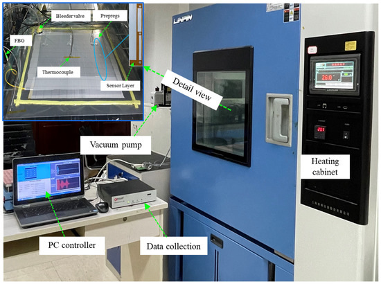 The experimental setup for cure monitoring based on ultrasonic guided waves. (a) Schematic diagram of prepreg molding process based on the VBM technology. (b) The detailed sensor layout. (c) Guided waves measurement system.