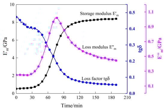 Conventionally, the dynamic mechanical analysis (DMA) test is a common method used to accurately measure the dynamic storage modulus and loss modulus of resin in the curing process. In this paper, the specimens were tested with the DMA test under double cantilever support, and the temperature rose and remained at 10 °C with a periodic oscillating force. The curing behavior of composites characterized by the DMA test is shown in Figure 3. As can be seen from Figure 3, the DMA results contained the variation curve of the storage modulus , loss modulus , and loss factor . The storage modulus is relative to the degree of cure (DOC), and it increased as the resin cured and arrived at the final value of approximately 8.4 GPa. Therefore, this parameter has the capability to identify several crucial steps including the gel point and vitrification point. On the contrary, the loss factor, the specific value of , showed a decreasing trend as the cure continued, and it eventually tended to a minimum value of about 0.053. This parameter can be used to estimate the energy variation throughout the curing process when the experimental specimen was cured at a constant temperature of 105 °C. The intersection of the loss factor and storage modulus curves is the point with the largest slope. At this point, the decreasing rate of the loss factor and the increasing rate of the storage modulus of the resin was fastest, indicating that the curing rate of the resin reached the maximum. The parameter of indicates the energy loss of irreversible deformation in the curing process. It can be found that it was not positively correlated with time. It increased gradually with time for the first approximately 75 min until it reached a local maximum. Then, the loss modulus decreased with time until it reached a minimum value.