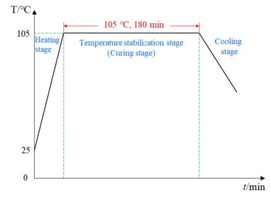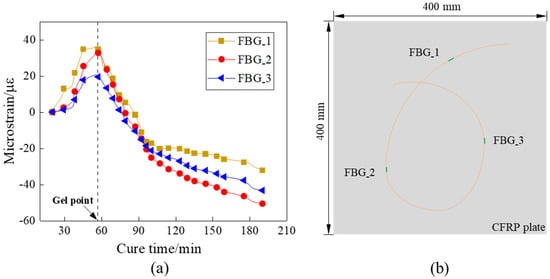 After the experimental preparation was completed, the regrading preform was placed into a heating cabinet for curing, and the recommended curing temperature profile is shown in Figure 4. The entire experiment process was carried out at a constant temperature of 105 ° C for 3 h. In the heating-up stage, the temperature rose from room temperature to 105 °C in the first 20 min, and then the temperature remained at 105 °C. Preceding studies have shown that the temperature and degree of cure field were evenly distributed in the curing process for thin CFRP plates (less than 2 mm), and the gradient of temperature and degree of cure can be ignored in the thickness scale. Therefore, the strain reduction is attributable to the chemical shrinkage of the resin rather than the exothermic reaction in the curing process. The strain field shown in Figure 5a was monitored by the distributed FBG sensor with three sensing points shown in Figure 5b, and the measurement of the strain signals was from the isothermal cure stage (20 min to 180 min). In the first 20 min to 58 min, the viscosity of the epoxy resin decreased and was prone to flow, resulting in an increase in strain. As the curing process continued, the curing shrinkage started and transferred to the FBG sensor. From this time, the strains measured by the FBG sensor began to decrease and the moment was determined as the gel point. It can be seen from Figure 5a that the gelation moments measured by the FBG sensors were consistent, indicating the uniformity of the curing degree and the correctness of the measurement results.