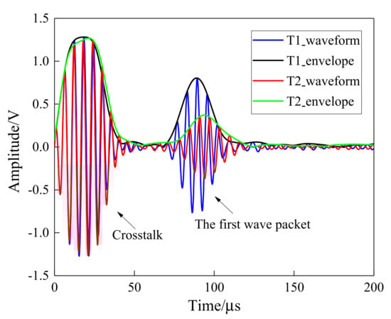 The Hilbert transform results on the received waveforms for one sensing path (T1 = initial moment, T2 = 20 min).