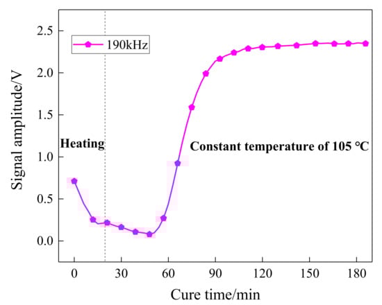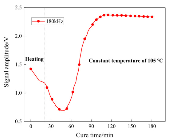 The amplitude and attenuation of guided waves were obtained by signal processing on the received waveforms. The Hilbert transform, as a reliable signal processing method, is easy to perform and can compensate for the effect of phase difference. Figure 6 shows the Hilbert transform results on the received waveforms at different curing moments of one sensing path. As can be seen, there was a distinct wave packet in the collected signal, which varies with curing time. The amplitude signals of the sensing path P7_4 (PZT 7 serves as an actuator and PZT 4 serves as a sensor) obtained in the experiment was processed and is further shown in Figure 7. The first 20 min was the heating-up stage, and the signal amplitude reduced with the increase in temperature and reached the minimum values. After that, the amplitude started to increase followed by a stable tendency.