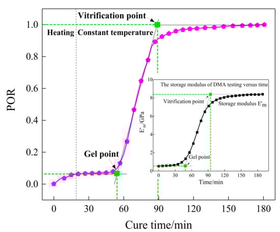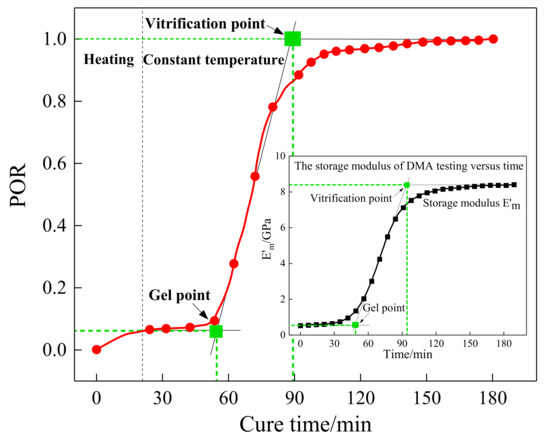 By making a comparison between Figure 8 and the storage modulus curve of the DMA test in Figure 3, it can be observed that the tendency of the POR curve was consistent with the storage modulus variation of the resin, and the first and the second characterization points that occurred in the curing progress were approximately equal to those of DMA results. Consequently, the presented POR curve can approximately characterize the change in storage modulus of the resin under the actual curing environment. To represent the degree of cure, the first and the second characterization points were approximated as the gel point and vitrification point. It can also be seen from the comparison between Figure 5 and Figure 8 that they almost had the same gel point, demonstrating the correctness of the determination of the crucial steps.