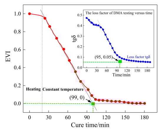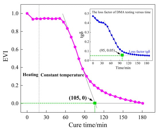 As described in Figure 3, the storage modulus continued to increase versus curing time, but the variation tendency of the loss factor was inverse to that of the storage modulus. As the resin cured, the loss factor continued to decrease until it reached a minimum, which means the continuous reduction in the system energy loss. Therefore, the energy variation index (EVI) can be used to characterize the changes in the system energy during the curing process, which is determined below: