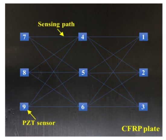 After the CFRP is demolded, the embedded piezoelectric-fiber hybrid sensor network can be permanently integrated with the structure to perform in situ and real-time structural health monitoring applications as it makes the composite part “smart”. In this section, damage identification and location were performed to assess the effectiveness of the embedded PZT sensor network, and a modified probability imaging method was proposed to deal with the disadvantage of the conventional PDI method and to improve the accuracy of damage imaging. The damage identification experiments were conducted on the demolded CFRP plate based on the modified PDI method. A simulated damage with a size of was attached to the CFRP surface at different locations. A diagrammatic sketch of the sensing paths is shown in Figure 14.