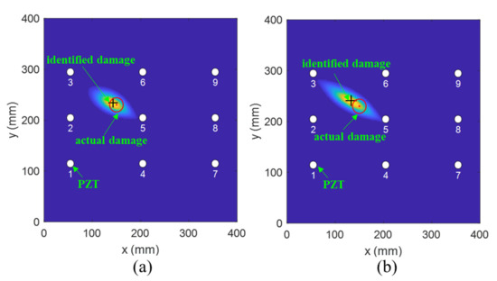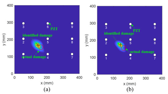 To investigate the effectiveness of the fused PDI method, a detailed analysis was conducted. Figure 15 and Figure 16 show the comparison results achieved by the fused and the conventional PDI method in the presence of one simulated damage at (150 mm, 230 mm) and (162 mm, 155 mm), respectively. The red circle and the black plus represent the actual damage and the identified damage, respectively. The white circle denotes the PZT transducer. Through observing Figure 15 and Figure 16, it can be easily found that the accuracy of damage detection and identification of the fused PDI method significantly improved compared with the conventional PDI method, indicating the applicability of the proposed method and the embedded PZT sensor network.