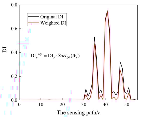 where N is the number of the sensing paths. Wr represents the weighting factor that is assigned to the r-th path. is a constant, representing the exponential decay rate of DI. It can be seen from Figure 18 that the relationship between the weighting factor Wr and the sensing path r tended to flatten as α increased. Meanwhile, the proportion of larger Wr values increased and the proportion of smaller Wr values decreased, which is not conducive to highlight the actuator-sensor paths associated with the damage. Furthermore, a comparison was conducted on the damage location results when α was set to 2, 4 and 6, and the reconstructed image results showed that it had a higher location accuracy when α was set to 2. represents that a specific weight is assigned to the sensing path according to the order of the DI value. By re-sorting, a larger DI corresponds to a larger weight, and a smaller DI has a smaller weight for highlighting the critical path adjacent to damage. The DI variation of all sensing paths before and after applying the weighted factor is shown in Figure 19. It can be seen that the progressive weakening of DI was realized by applying the weighting factor to the corresponding sensing path. Finally, the dynamically adaptive shape factor can be determined by Equation (7).