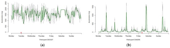 Two profiles with large average activity profiles, with the green line being the hourly profile, the grey line the 5 min profiles and the red notches indicating the presence of imputed values for that time period. (a) Participant whose activity levels remain high for the entire 7 days. (b) Participant whose activity levels spike to high values on several occasions.