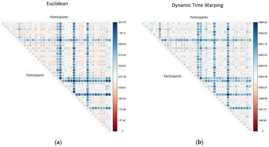 A comparison of the distance matrices calculated using two different distance metrics, with participant pairs: (a) calculated using a Euclidean metric; (b) calculated using a dynamic time warping (DTW) metric.