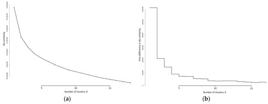 Dis-similarity metrics as the number of clusters, k, increases: (a) as dis-similarity; (b) as the first difference in dis-similarity.