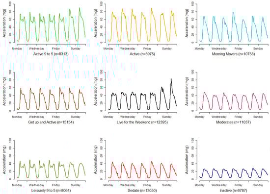 Having arrived at a solution with nine clusters, the plausibility and differentiation of the resultant overall patterns of activity associated with each cluster helps to validate the choice of the number of clusters. For the nine-cluster solution, the average activity patterns within each cluster is shown in Figure 4, with descriptive labels below each chart. Additionally, the medoids and average profiles for all cluster solutions k = 1 to k = 16 are provided in the Supplementary Material. Here we introduce the nine clusters and provide a short descriptive label for each cluster. These labels are for convenience to aid interpretation and commonly used in clustering work [60,61]. Care has been taken to minimise subjectivity and potential stigma.