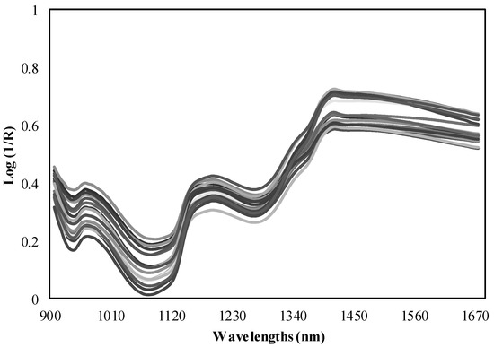 NIR measurements were taken by the direct application with the MicroNIR spectrometer on tubers. Six replicate spectra were recorded for each sample and the average of the spectra was calculated (Figure 1). Spectra were recorded using the instrument acquisition software MicroNIR™ Pro v.2.2 (VIAVI, Santa Rosa, CA, USA) at intervals of 6 nm in the spectra in a range between 900–1700 nm. Spectral data were downloaded directly from the NIR equipment to a laptop connected through a USB port. However, this miniaturized spectrometer has the advantage of operating while it is connected by an USB interface to a tablet or wirelessly connected to a smartphone [28]. MicroNIR used a Spectralon® ceramic tile as a white reference (100% reflectance) of polytetrafluoroethylene (~99%). The obtained spectra were combined into the spectral matrix, where the diffuse reflectance signal of the NIR spectrum is expressed as reflectance (R), using the values of log (1/R) for the chemometric analyses.