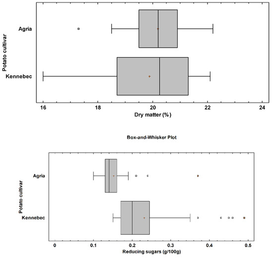 The mean dry matter content was similar between the tubers of Agria and Kennebec (p = 0.68) (Figure 2), with a mean value of 20.19% and 19.88%, respectively (Table 1). The box and whisker plot showed a higher range in the dry matter content of Kennebec tubers, with values between 16.0% and 22.1% (Figure 2), and a relative standard deviation of 1.63%. Regarding the reducing sugars, Kennebec cultivar had a significantly higher content than Agria (p < 0.0001), with a mean value of 0.23 g/100 g, and maximum value of 0.49 g/100 g (Figure 2). Agria tubers had a mean value and maximum value of 0.15 g/100 g and 0.37 g/100 g, respectively (Table 1). Therefore, the greater relative standard deviation in reducing sugars content in Kennebec tubers was found (0.09 g/100 g).