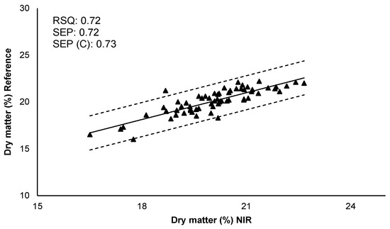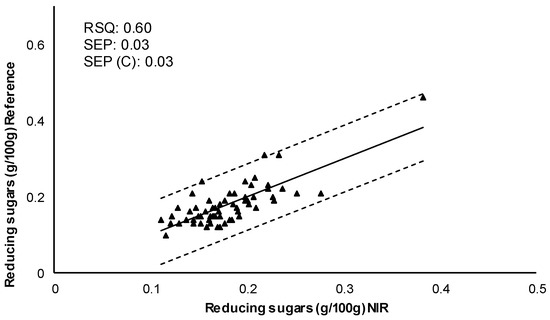 Cross-validation was carried out to evaluate the robustness of the obtained models. The set of calibration samples was divided into six subsets, of which five subsets were used for calibration and the other subset for the prediction set. This procedure was carried out several times, with the objective that all of the subsets were subjected to the calibration and prediction process. Subsequently, the resulting models for each parameter were validated and its predictive capacity was determined. The correlation between the values of reference (obtained by the reference method in laboratory) and the values predicted by NIR are represented in Figure 3. Internal validation showed better results for dry matter (higher RSQ and good errors of prediction) than reducing sugars. SEP, SEP (C), and bias indicated that the calibration models for the two quality parameters allows their determination. Therefore, the results reflected the prediction capacity and validity of the models. Although a larger number of samples including more types of potato cultivars, and more growing seasons could improve the predictions of these quality parameters.