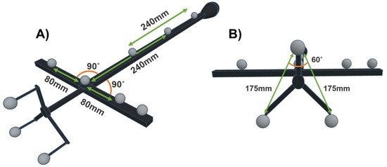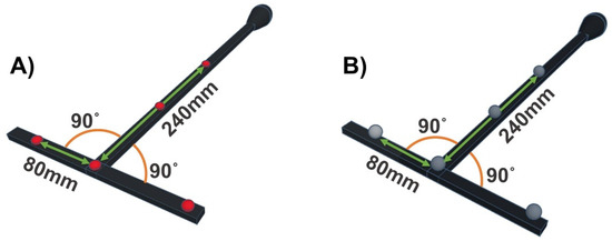 Schematic of the defined linear and angular marker geometries of CO1. (A) the active marker version of CO1 (B) the passive marker version of CO1.