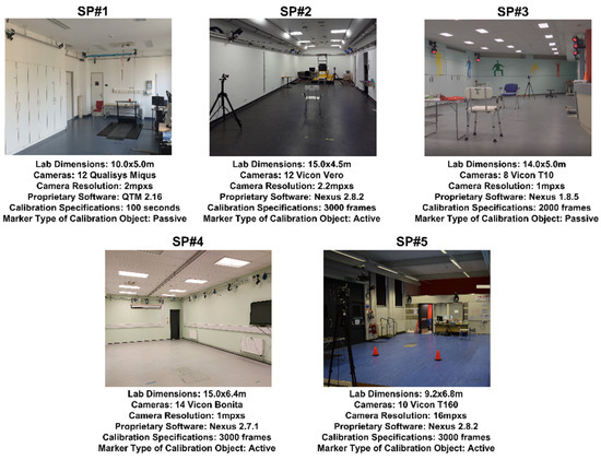 To evaluate its suitability in the context of a multicentric study, the QC check was implemented as part of an ongoing data collection for the IMI project Mobilise-D [22]. This study includes data collected from five different SP systems in different locations, with varying laboratory and system setups, SP system manufacturers and operators, as shown in Figure 3. The desired capture volume to be covered by all SP systems was defined as 5 m × 4 m × 2 m. Each site was instructed to calibrate its SP system following their standard procedures. Prior to implementation, all operators were trained by OP1 on how to perform the QC check using the instructions described in the inter-operator intra-session protocol. All sites used the CO1 object for this study (Figure 1), with either active or passive markers. Each laboratory completed the QC check on 10 different system calibrations all on different days of data collection.
