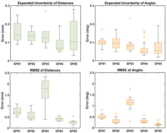 Box charts of the expanded uncertainty and RMSE calculated for the distances and angles of the 10 QC checks completed by the five sites.