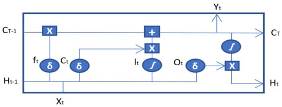 represents the forget gate, which handles the amount of information to be kept and dropped. It is consumed by the function, which scales the values between 0 and 1, thus dropping values <0.5. represents the input gate that quantifies the importance of the next input () and updates the cell state. The new input () is standardized between −1 and 1 by the function, and the output is point-wise multiplied by . represents the state of the cell at previous timestamps, which is updated after each time step. The information required to update the cell’s state is gathered at this point, and a bit-wise multiplication is carried out between the previous cell state () and the forget vector. This is followed by the bit-wise addition with the output of input gate, and the cell state is updated. Finally, the output gate () determines what the next hidden state should be. The hidden state encapsulates the information regarding previous inputs (). The flow of information through the following gates is mathematically shown in Equation (1).